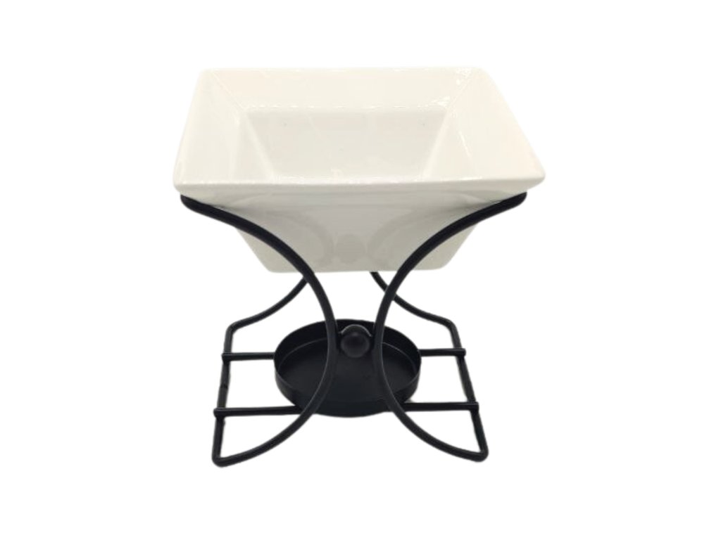 Tento moderný keramicko-kovový štvorcový stojan je navrhnutý pre milovníkov čistého dizajnu a harmónie. Spojenie bielej keramiky a čierneho kovu vytvára elegantný kontrast, ktorý vynikne v každom interiéri. Stojan je vhodný na použitie pri aromaterapii, rituáloch alebo ako vkusný dekoračný doplnok.