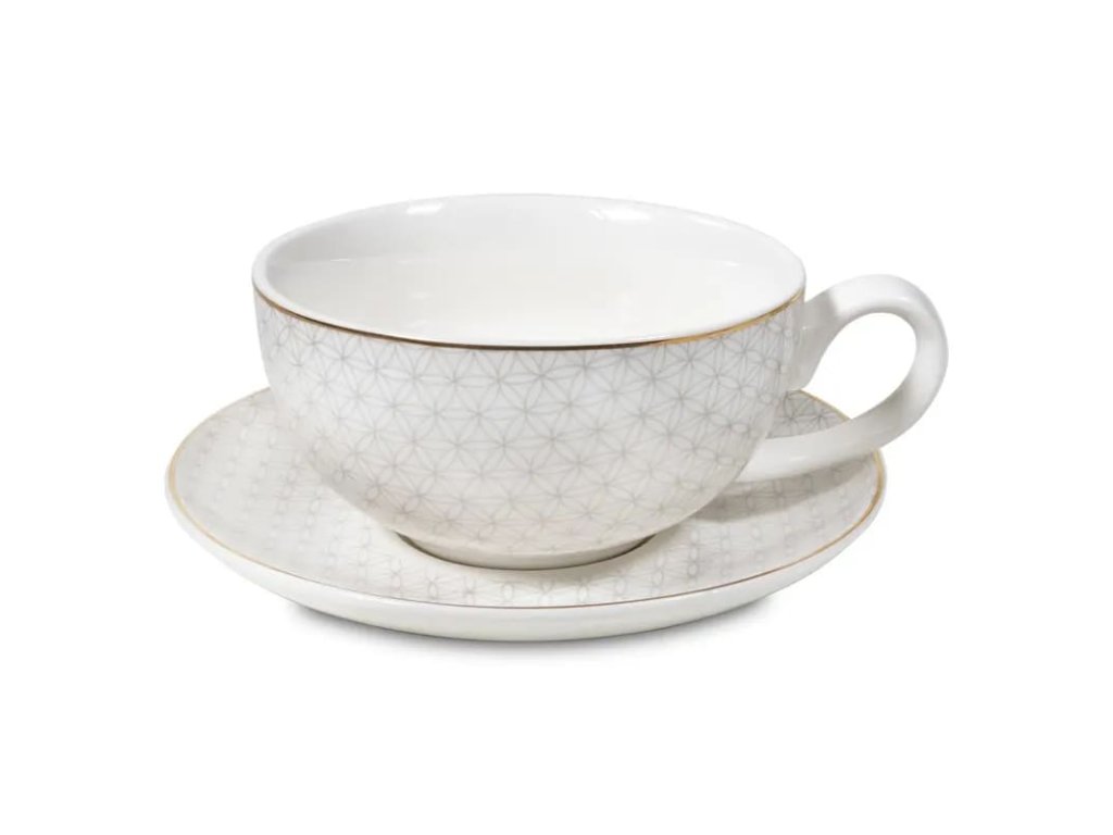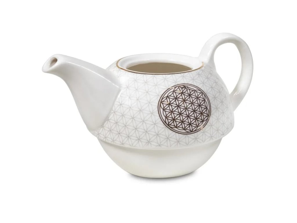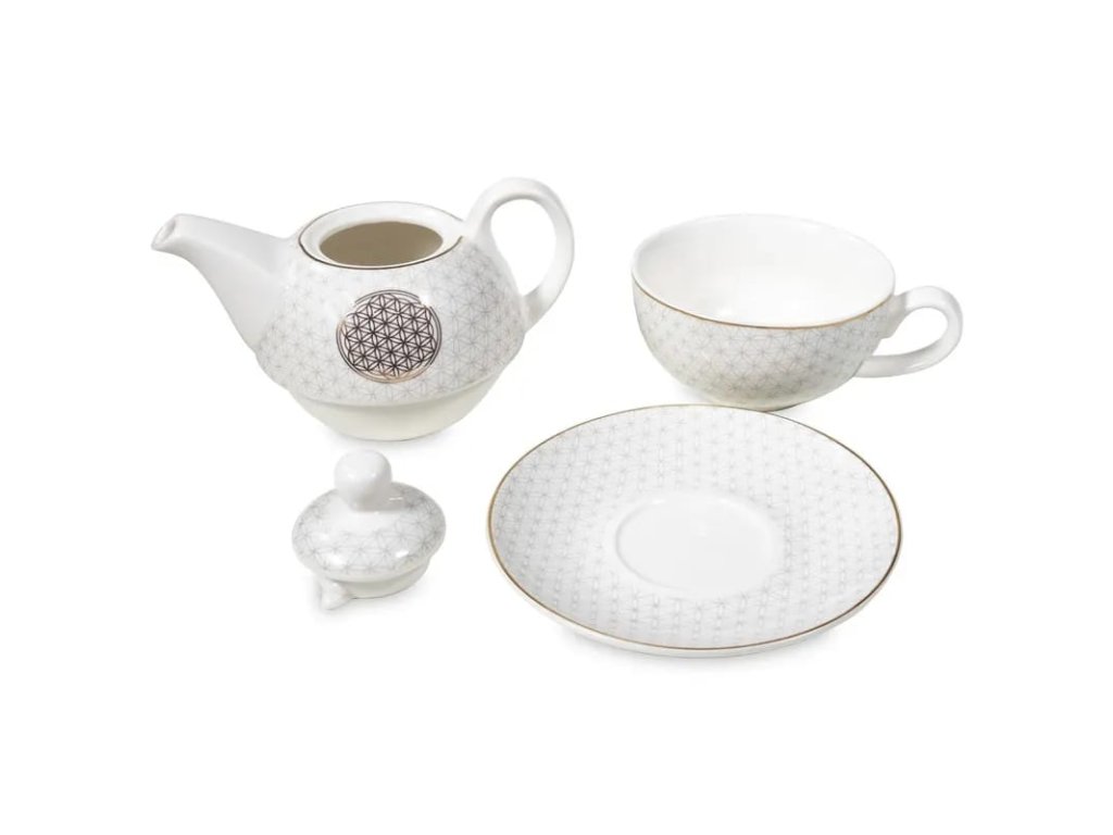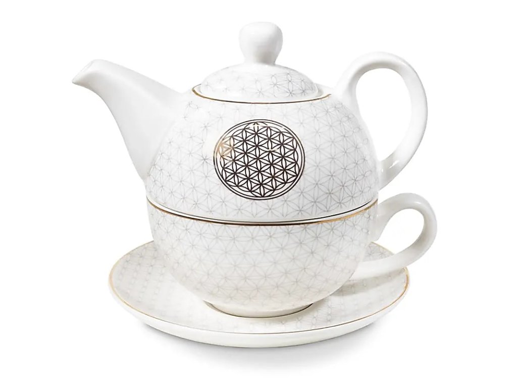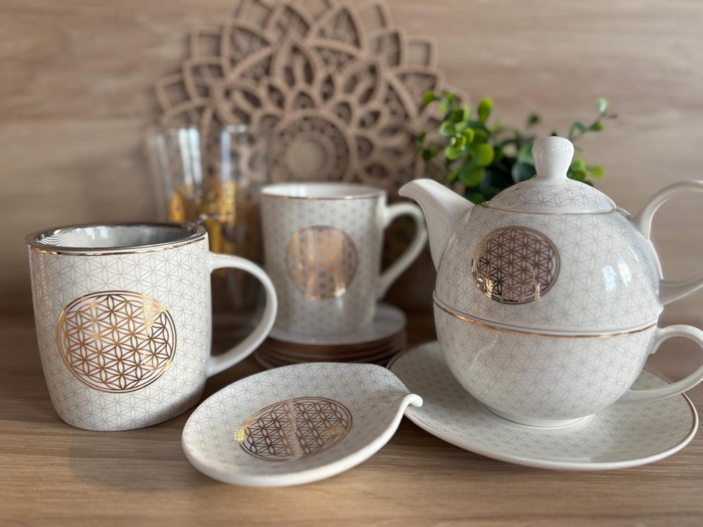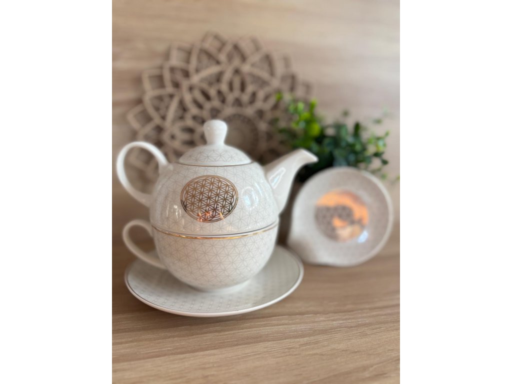 Elegantná čajová súprava pre jednu osobu zdobená posvätným symbolom Kvetu života v zlatom prevedení. Vďaka premyslenému dizajnu sa šálka, kanvica a tanierik dokonale skladajú do jedného kompaktného celku, ktorý je praktický a zároveň estetický.