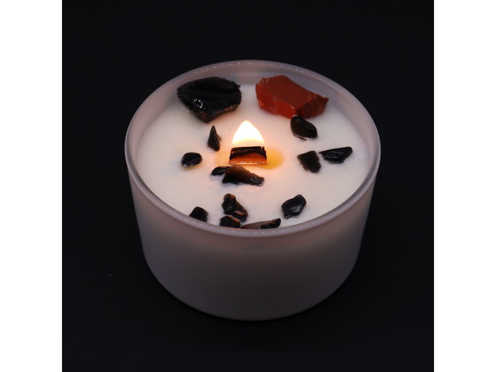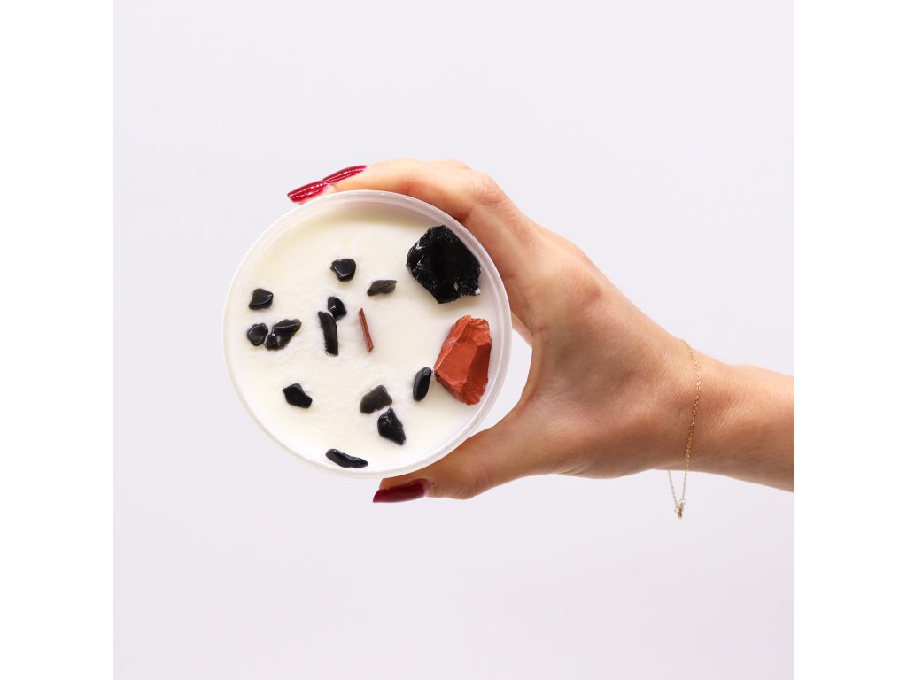 Kryštály červeného jaspisu a čierneho achátu, ktorými je sviečka zdobená, podporujú vnútornú silu, stabilitu a ochranu. Vôňa Čierneho oudu prináša hrejivý, zemitý pocit pokoja a bezpečia – ideálny pre meditáciu, ukotvenie energie a návrat k sebe.