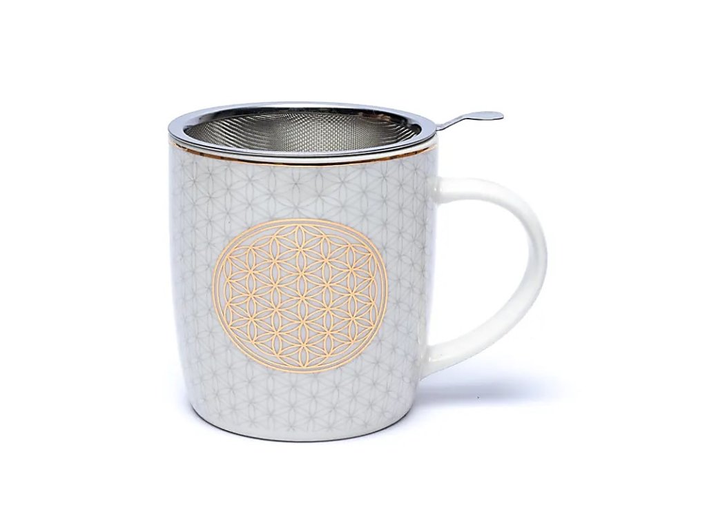 Elegantný Bone China porcelánový hrnček s jemným slonovinovým odtieňom a nerezovým sitkom je ideálny na vychutnávanie sypaných čajov. Motív Kvet života, starodávny symbol spojenia všetkého života vo vesmíre, prináša energiu, rovnováhu a vitalitu do každého dúška. Symbol sa prenáša aj do tekutín, ktoré hrnček obsahuje, čím dodáva chvíľam čajového rituálu hlbší zmysel.Elegantný Bone China porcelánový hrnček s jemným slonovinovým odtieňom a nerezovým sitkom je ideálny na vychutnávanie sypaných čajov. Motív Kvet života, starodávny symbol spojenia všetkého života vo vesmíre, prináša energiu, rovnováhu a vitalitu do každého dúška. Symbol sa prenáša aj do tekutín, ktoré hrnček obsahuje, čím dodáva chvíľam čajového rituálu hlbší zmysel.