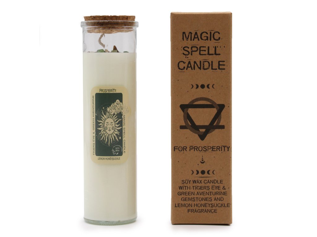 Vnes do svojho života energiu hojnosti s magickou sviečkou Prosperita, ktorá spája silu tigrieho oka, zeleného avanturínu a sviežu vôňu citrónového zimolezu. Táto ručne vyrábaná sójová vosková sviečka je vytvorená na posilnenie energie rastu, finančného úspechu a životnej stability.