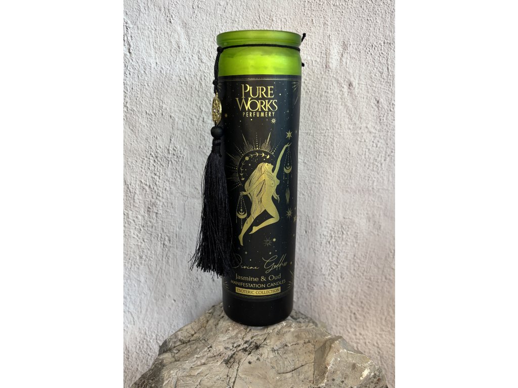 Luxusná manifestačná sviečka v elegantnej farebnej sklenenej nádobe s dekoratívnym strapcom. Ručne odlievaná zo zmesi sójového a palmového vosku, obohatená o esenciálne oleje s božsky ženskou vôňou jazmínu a oudu.