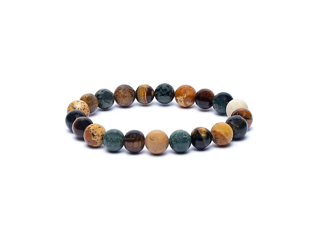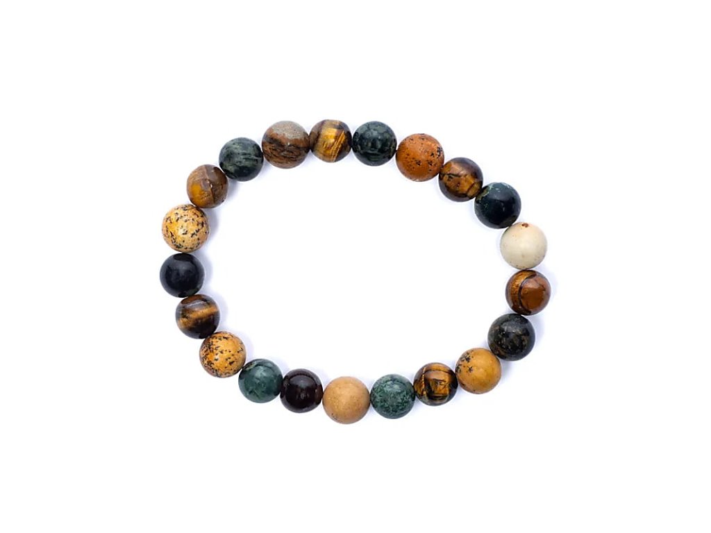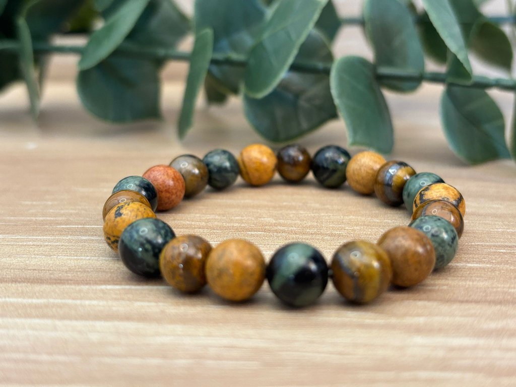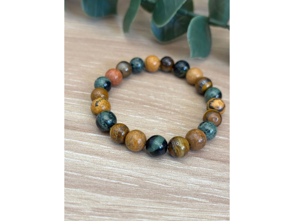 Elegantný náramok vyrobený z kombinácie troch harmonizujúcich prírodných kameňov – kambaba jaspis, tigrie oko a picture jaspis. Navlečený na elastickej šnúrke, vhodný pre každodenné nosenie aj duchovnú podporu.