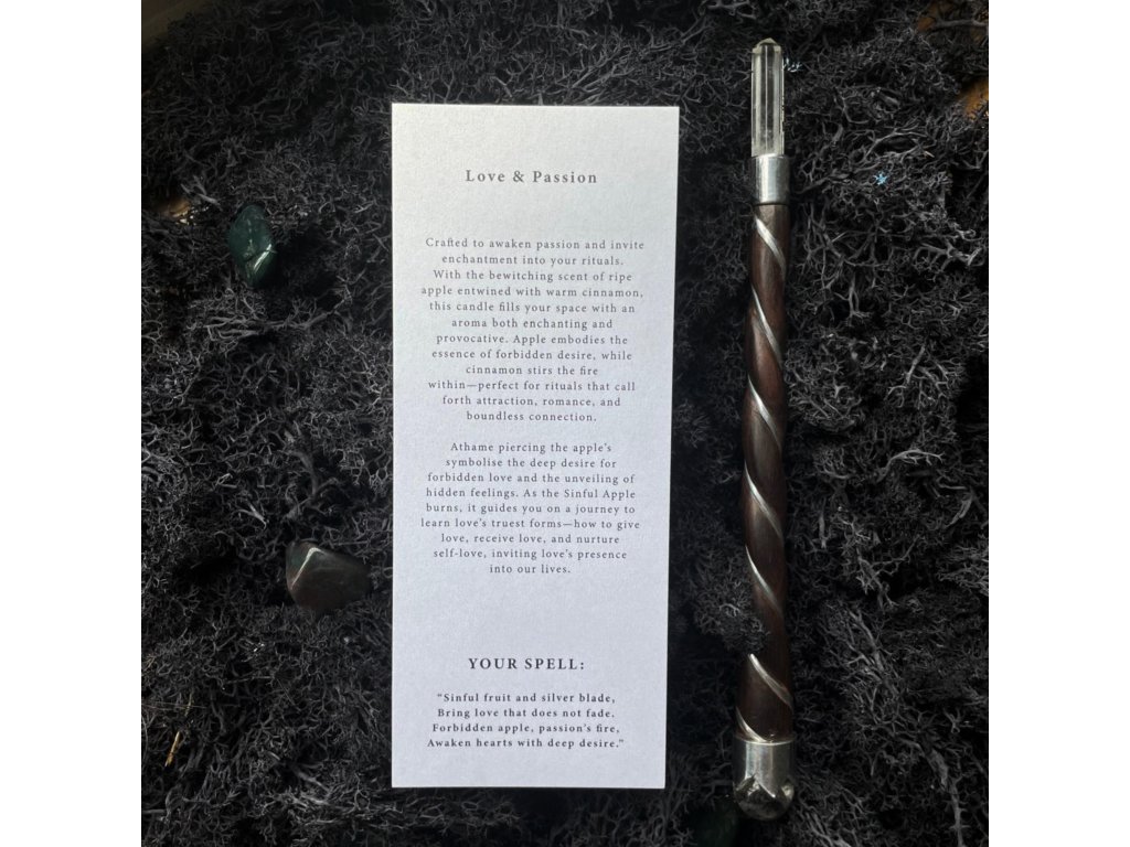 Táto sviečka prebúdza energiu lásky, vášne a príťažlivosti. Vôňa čerstvo odtrhnutého jablka v spojení s hrejivou škoricou vytvára zmyselnú a neodolateľnú atmosféru. Každý plameň je pozvánkou k intenzívnym emóciám, hlbšiemu spojeniu a magickému očareniu.