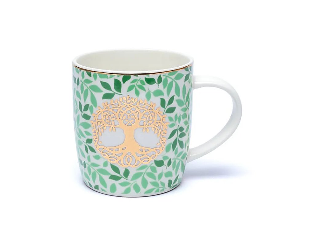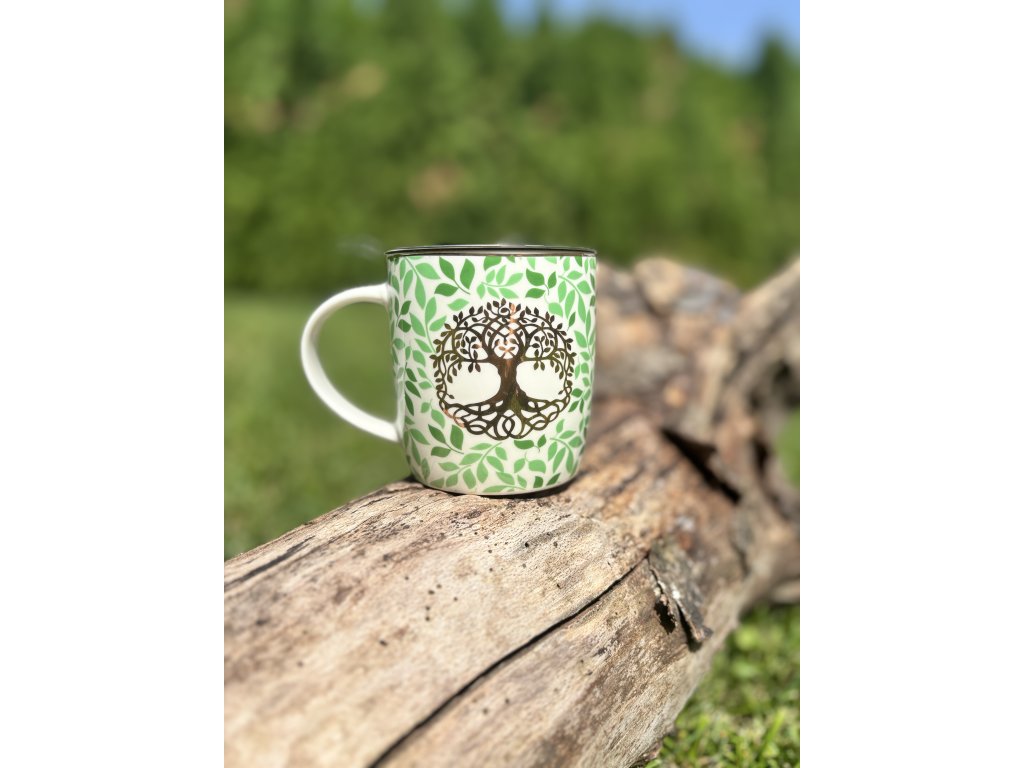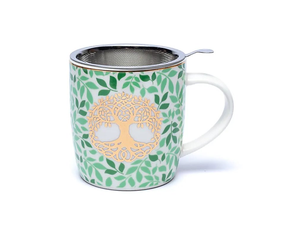 Elegantný Bone China porcelánový hrnček s jemným slonovinovým odtieňom a nerezovým sitkom je dokonalým spoločníkom na vychutnávanie sypaných čajov. Motív Stromu života prináša energiu, stabilitu a duchovnú pohodu do každého dúška.
