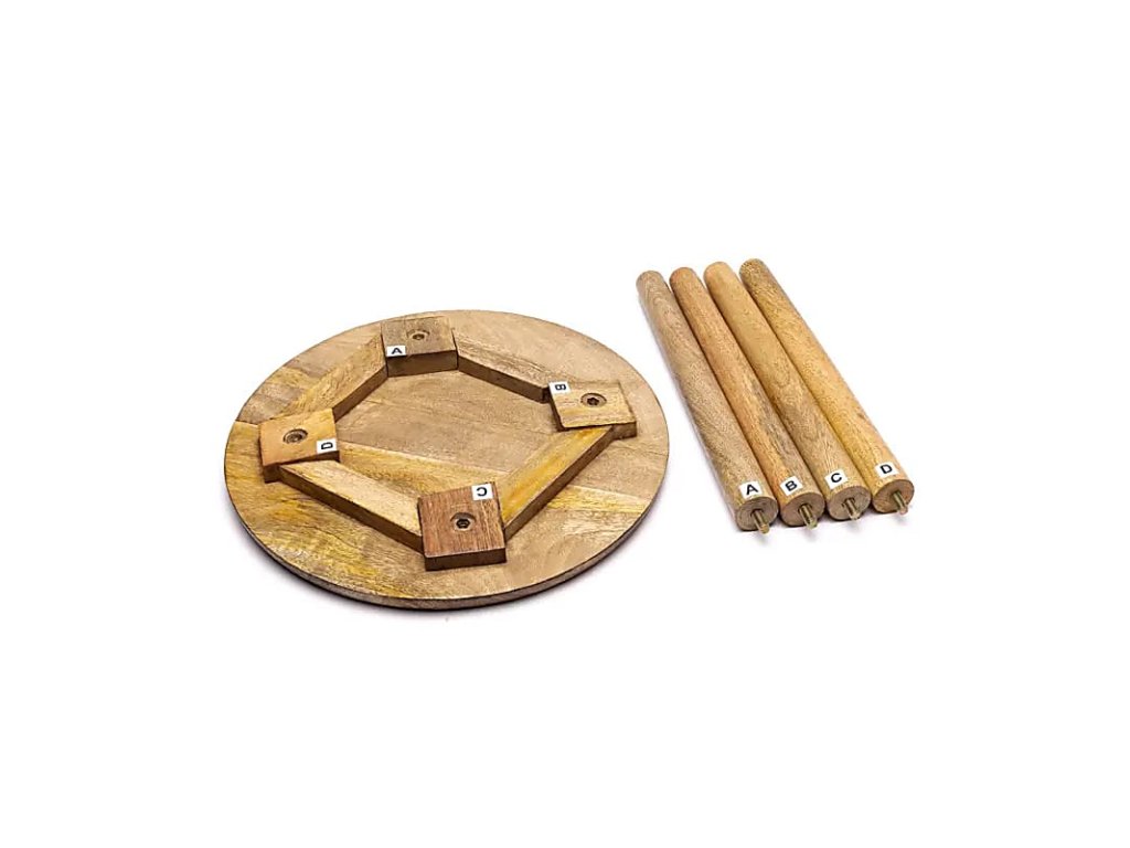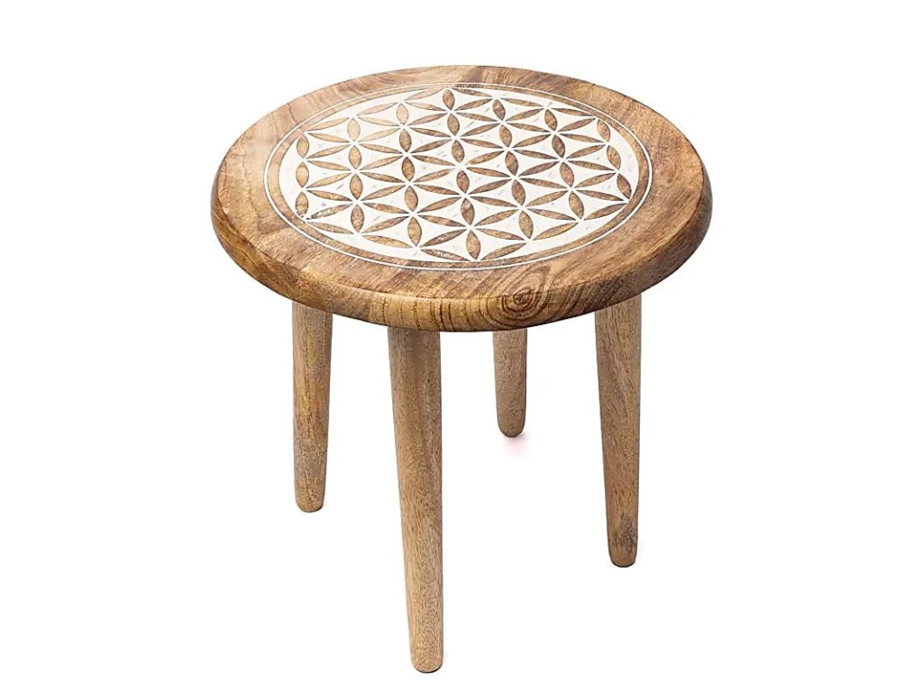 Elegantný a kompaktný stolík vyrobený z masívneho mangového dreva. Vrchná doska zdobená štýlovou bielou potlačou Kvet života, ktorá mu dodáva jedinečný duchovný rozmer.