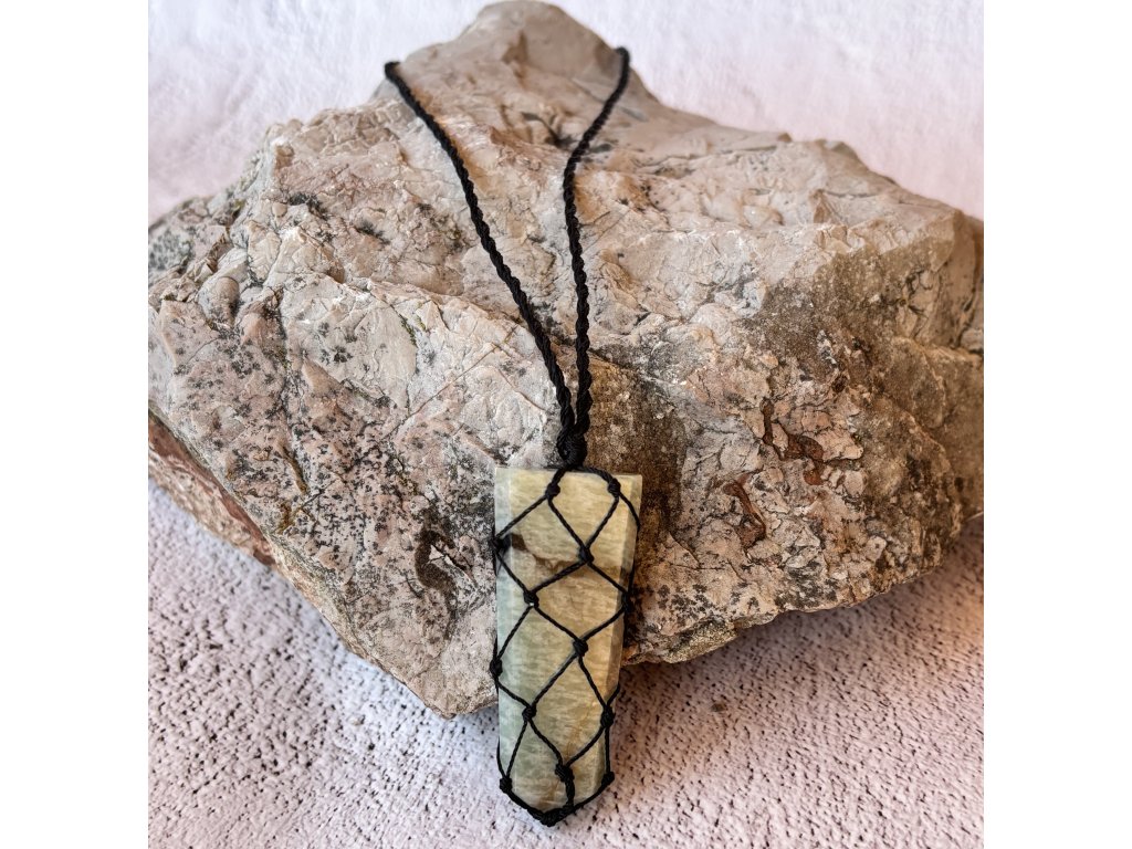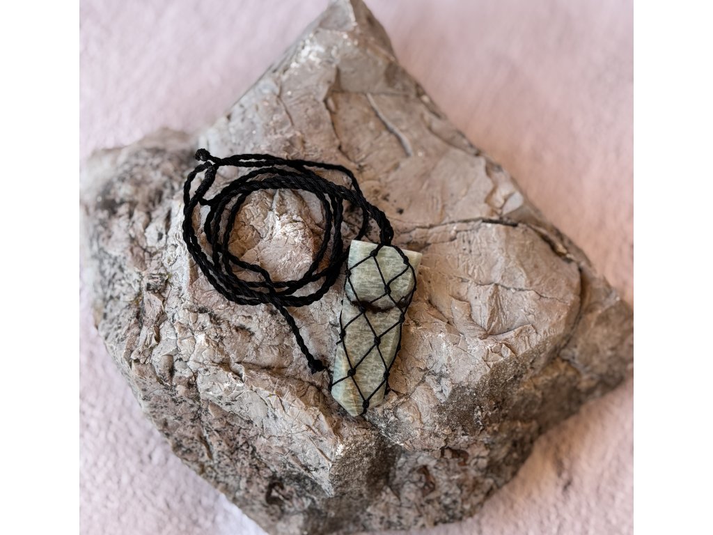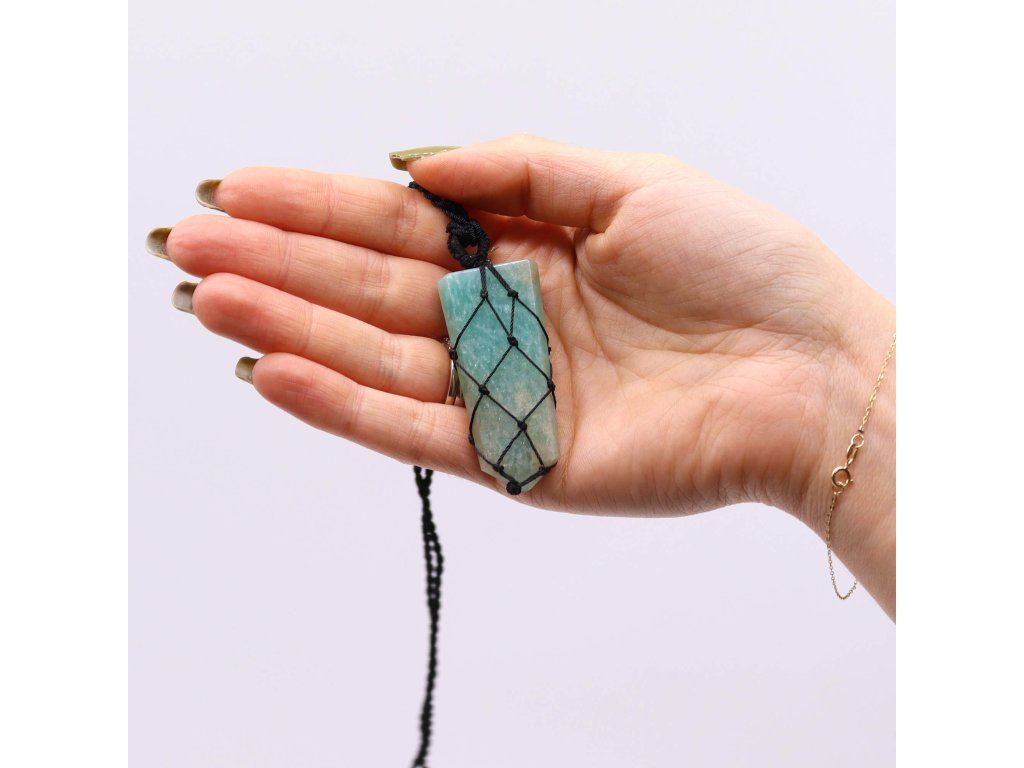 Amazonit je kameň odvahy, harmónie a vnútornej slobody. Pomáha uvoľňovať stres, vyrovnáva emócie a podporuje otvorenú komunikáciu. Tento prívesok s plochým hrotom, viazaný čipkovanou šnúrkou, je nielen elegantným doplnkom, ale aj talizmanom pre vnútorný pokoj a vyrovnanosť.