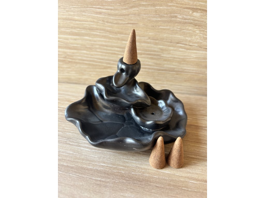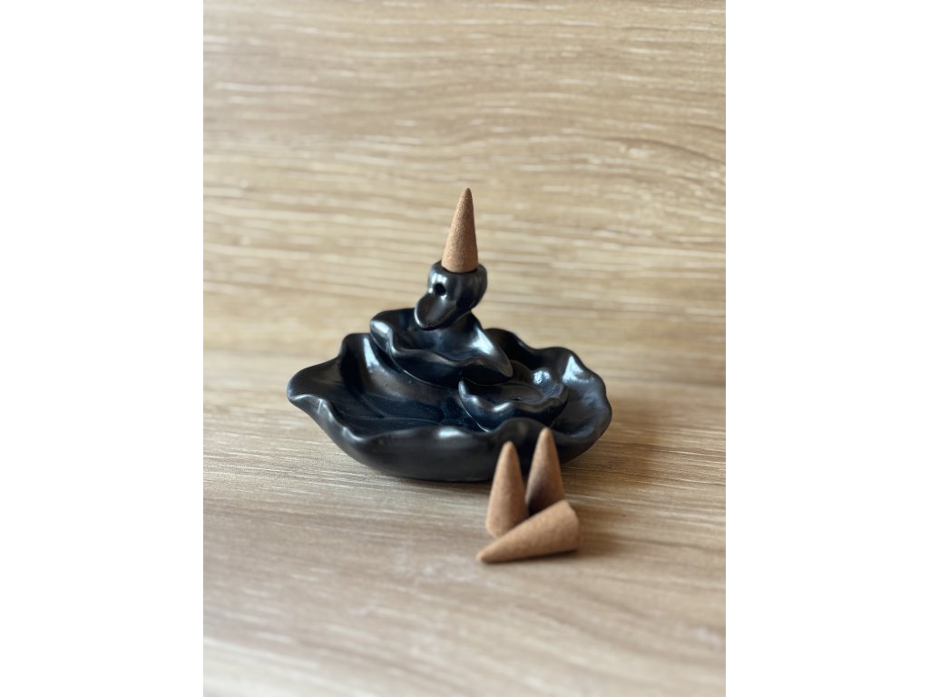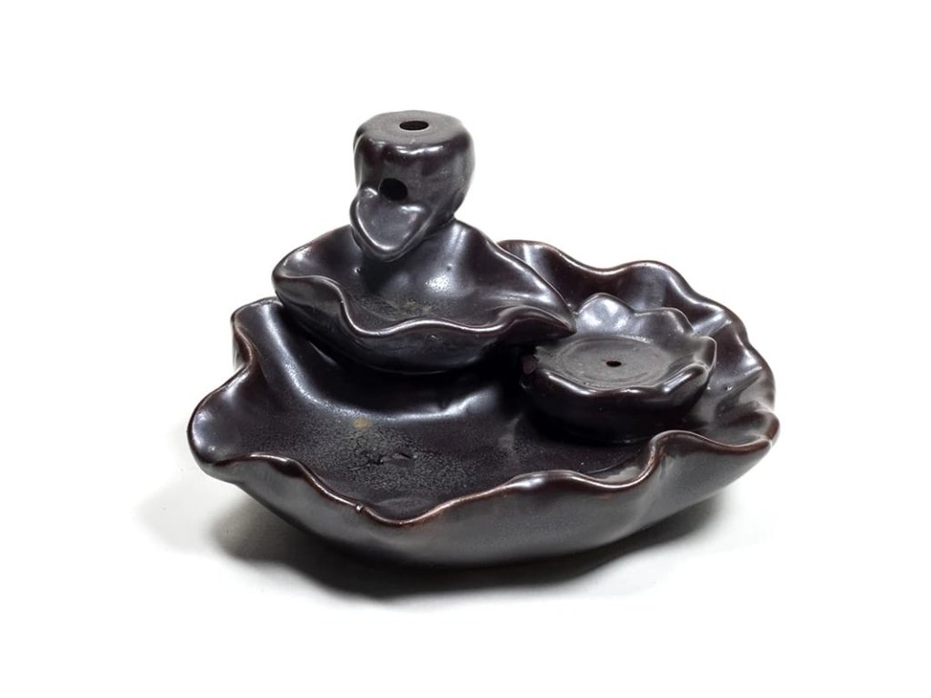 Tento elegantný keramický stojan s motívom lotosu na jazierku je navrhnutý pre kúzelný efekt spätného toku dymu. Dym sa nezodvihne hore, ale jemne prúdi po dvoch úrovniach ako vodopád – pripomínajúc tiché, pokojné ráno pri jazere.